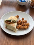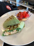 Three egg whites, smoked turkey, spinach, roasted tomato and feta cheese in spinach herb tortilla served with fresh fruit.